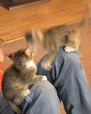 I am enjoying getting to know them and figure out their personalities and similarities and differences. They are the friendliest little kittens, run up to the door with their tails straight up when I go in to visit and won't go play in the house when I let them out until I give them each some loves.
